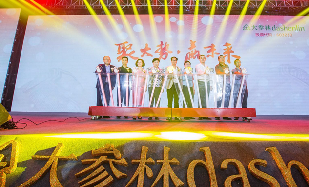 六合联盟药业集团董事长刘景萍女士与大参林医药集团董事长柯云峰先生、中国医药商业协会执行会长付明仲女士等嘉宾共同开启了“聚大势•赢未来"大参林工商合作峰会的大幕。